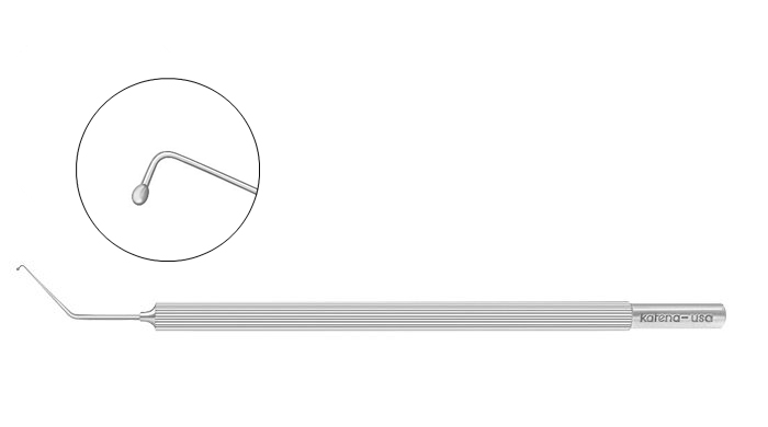 Manipulador de Flap con la punta en forma de oliva, se utiliza para presionar la cornea y localizar el borde del flap. Una vez localizado el borde y gracias a su punta pulida, se desliza alrededor del flap separándolo parcialmente, para posteriormente levantarlo suavemente con una pinza o espátula.